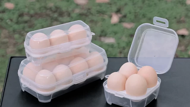 Budget-friendly transparent egg organizer from Gocamping Store. Options for 3/4/8 grids, $12.37 (68% off). Ships to US in 12 days. Listing lacks clear material and dimension details.