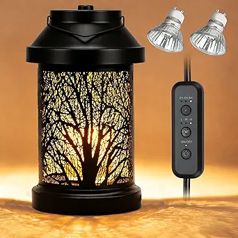 Affordable vintage-style candle warmer lamp with 3-level dimming, 2/4/8H timers, and two 50W bulbs. Fits jars under 4.1"—listing omits some electrical/safety specs.
